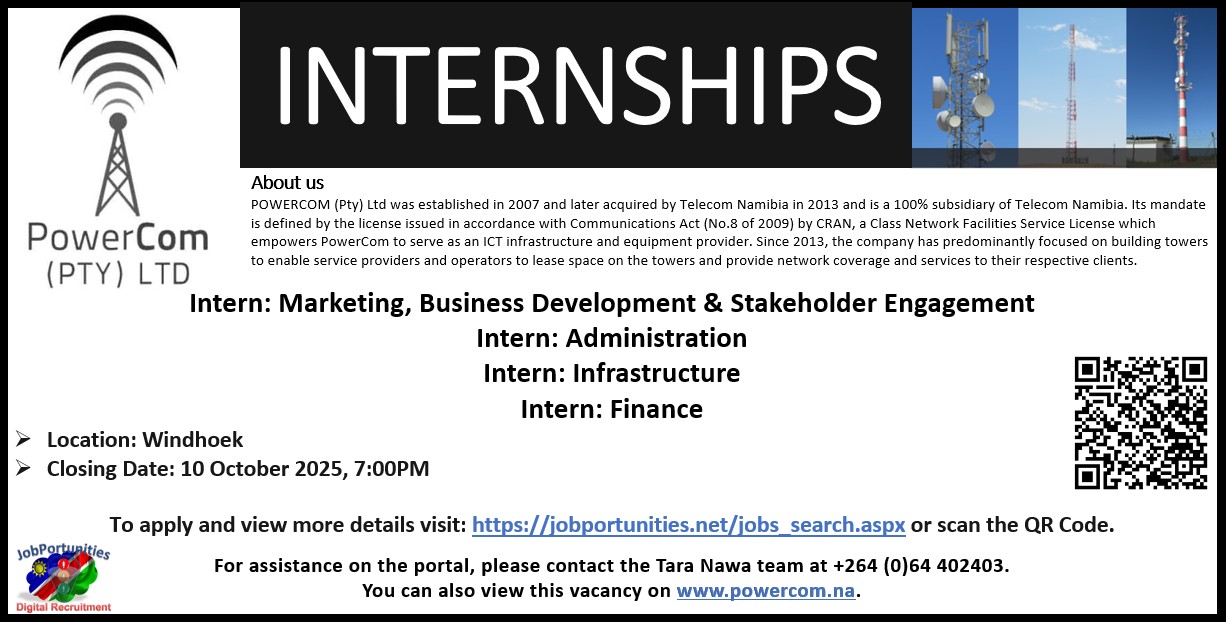- Intern: Marketing, Business Development & Stakeholder Engagement – Closing Date: 10 October 2021: 7:00PM